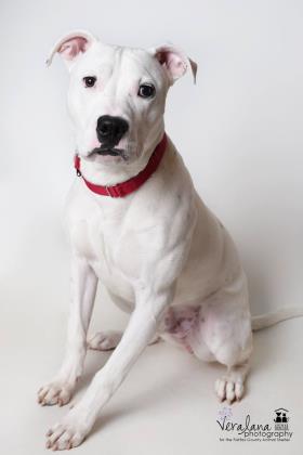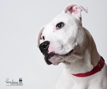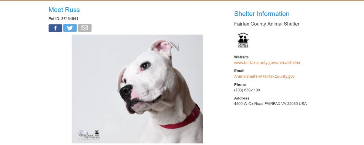 Size: Small Russ has fast become a shelter favorite! He is so handsome with his sweet face and speckled ears and has such a fun personality. He loooooves treats and has been known to stick his face in any pockets that may contain some tasty treats. He knows some basic obedience and will sit when you ask (or when he anticipates it will earn him a yummy reward). He is super playful and just lights up when he sees other dogs. He has done very well in our doggy playgroups when he’s matched up with other rough and tumble buddies. And after all the playing, he’s happy to crawl his 50 pound body into your lap for some love and ear scratches. He came to the shelter as a stray, so they don’t know much about his history, but all signs point to him being an awesome best friend for some lucky adopter! For more information, please contact the Fairfax County Animal Shelter at animalshelter@fairfaxcounty.gov.